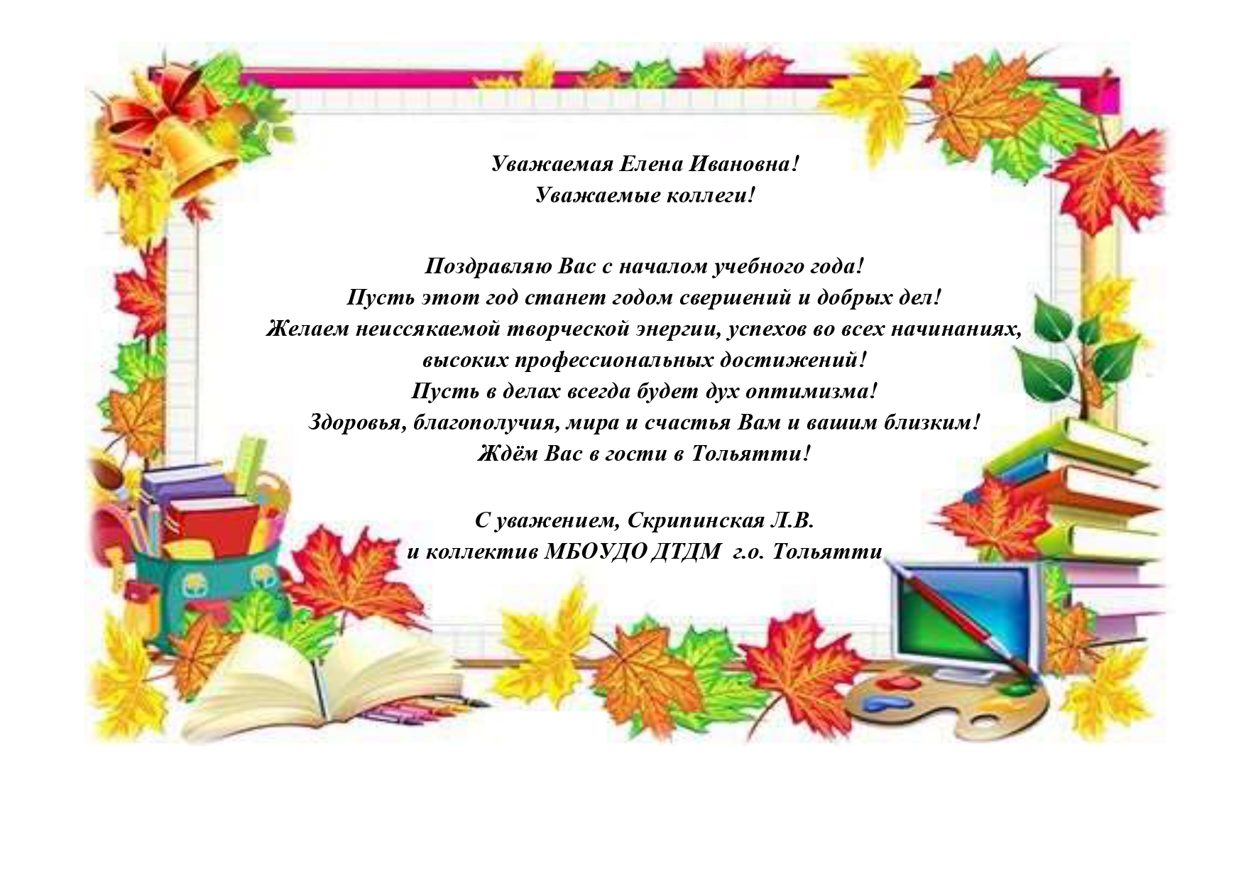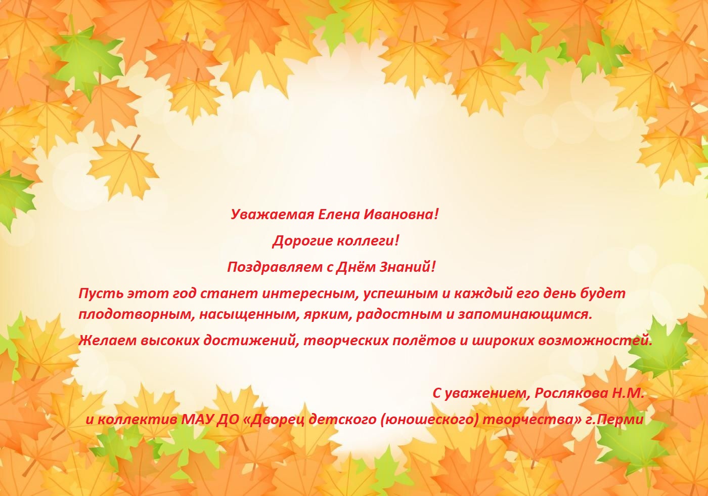 Взаимно поздравляем Ваш коллектив с Днем знаний. Пусть престоящий учебный год принесет радость открытий, станет пложотворным и по-настоящему счастливым для каждого из Вас. Желаю Вам успехов, доброго здоровья и благополучия)