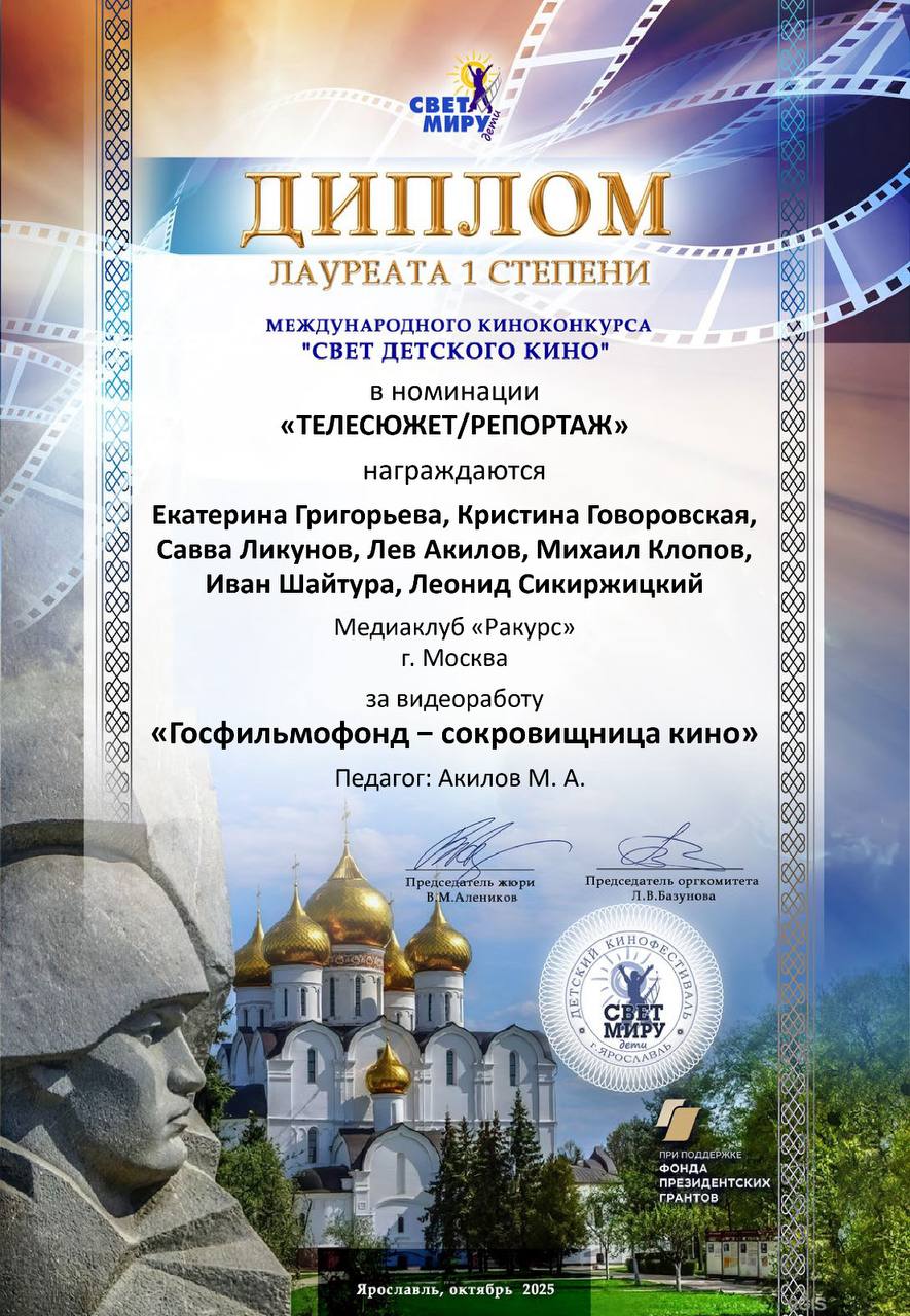 - Лауреатом I степени в номинации «Телесюжет/Репортаж» стала видеоработа ребят - «Госфильмофонд – сокровищница кино».