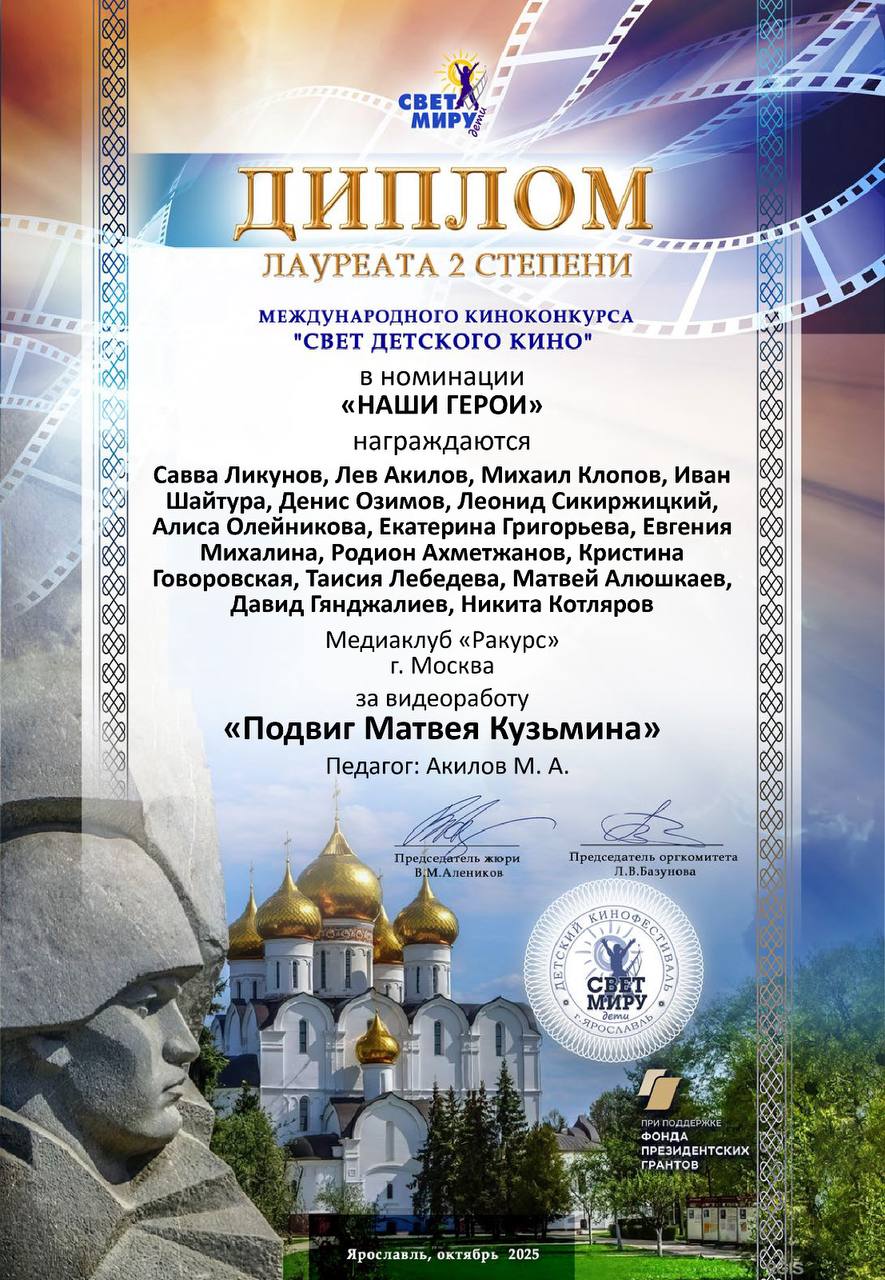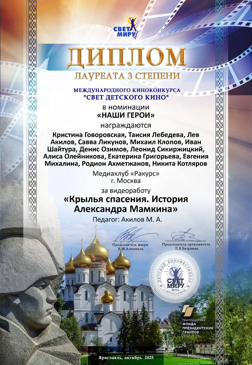 Медиаклуб «Ракурс» завоевал дипломы Лауреатов I, II и III степени на международном конкурсе «Свет Детской Анимации» в рамках кинофестиваля «Свет Миру. Дети»!
