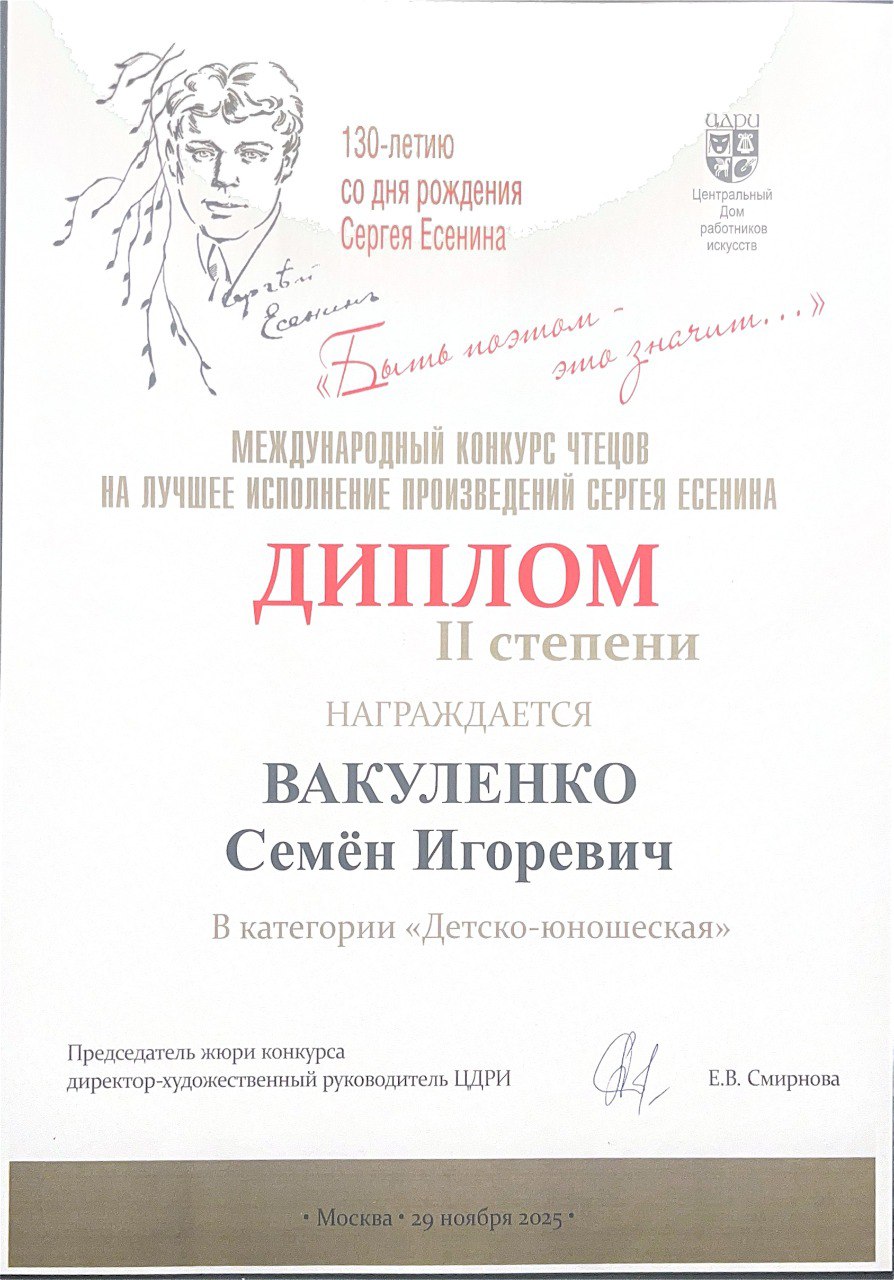 Обучающийся студии «Слово» Центра «На Сумском» Семен В. занял второе место на международном конкурсе чтецов «Быть поэтом — это значит…». Конкурс посвящён лучшим исполнениям произведений Сергея Есенина, и выступление